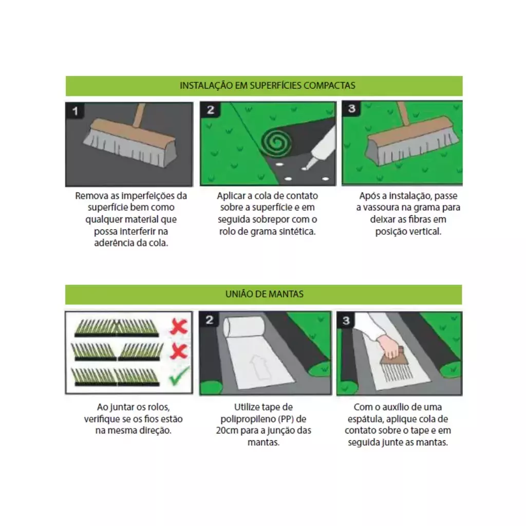 Grama sintética em ambientes internos: é ideal utilizar uma vassoura e/ou aspirador de pó para limpeza leve, além de passar um pano úmido para manter o aspecto novo das cerdas. Em caso de sujeiras ou manchas mais resistentes, é indicado utilizar o auxílio de uma esponja.