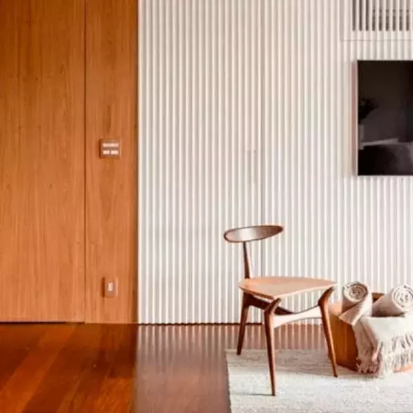 Os painéis ripados em poliestireno possuem ranhuras e sulcos, imitando o efeito ripado característico da madeira, proporcionando um visual elegante e moderno aos espaços.